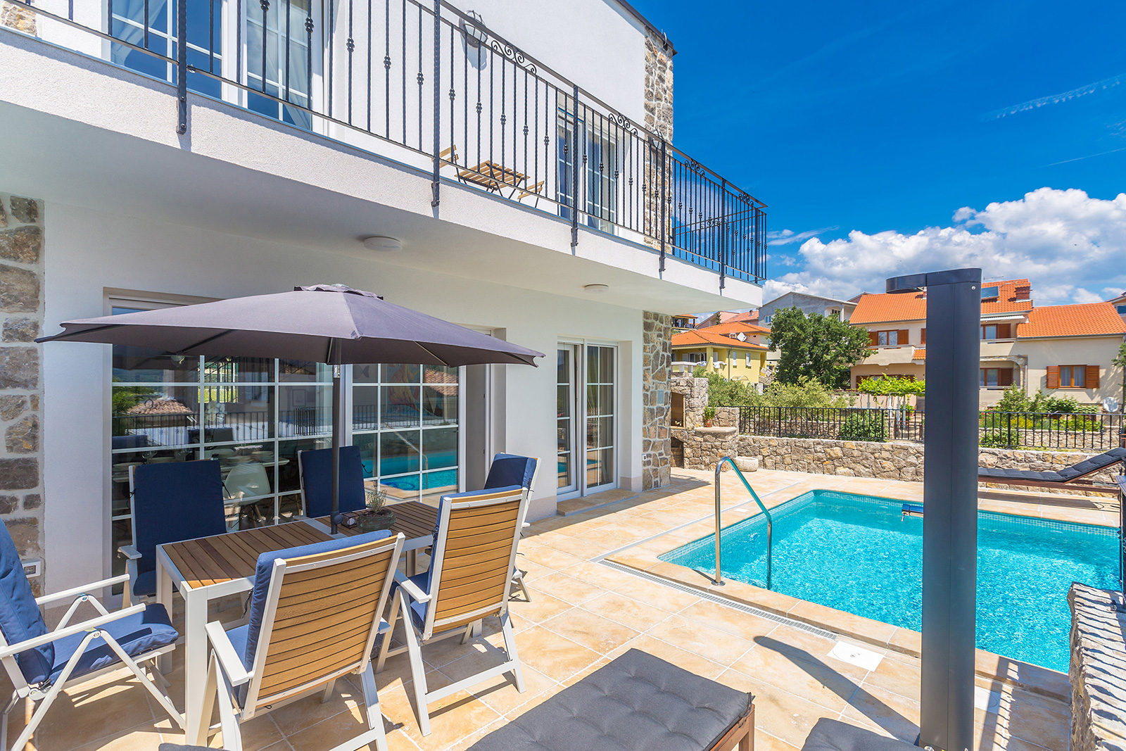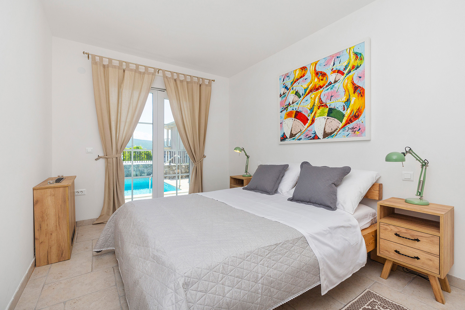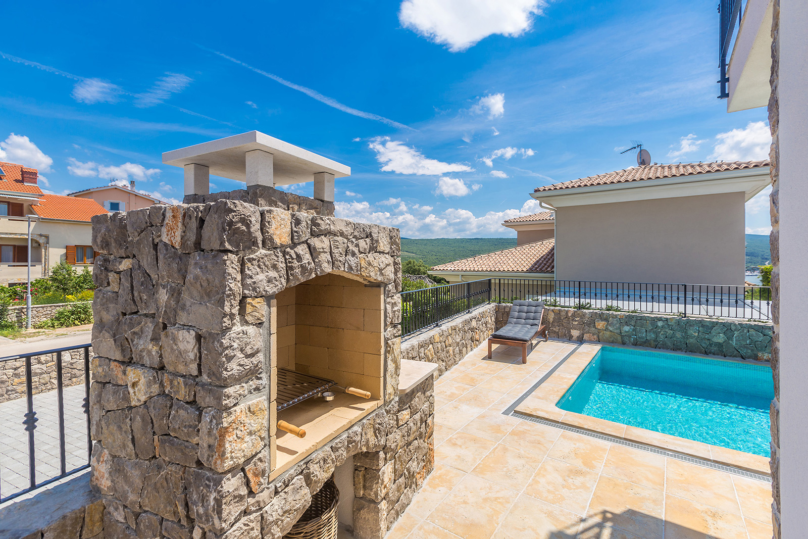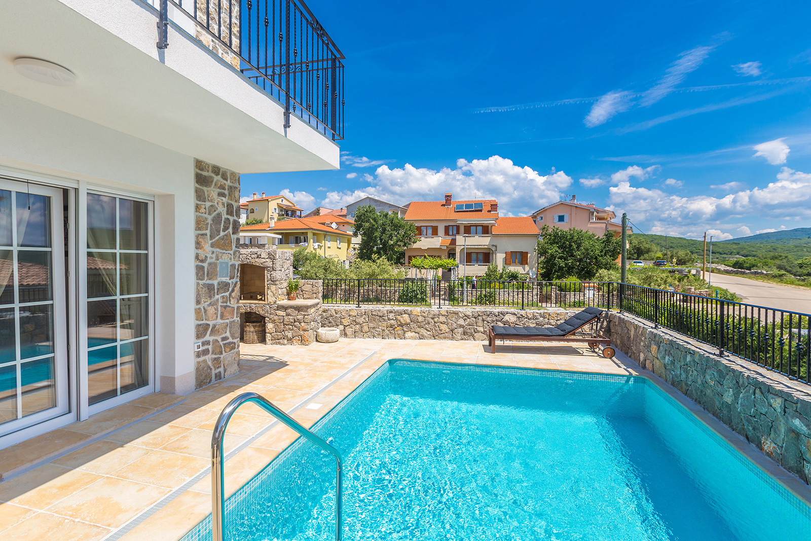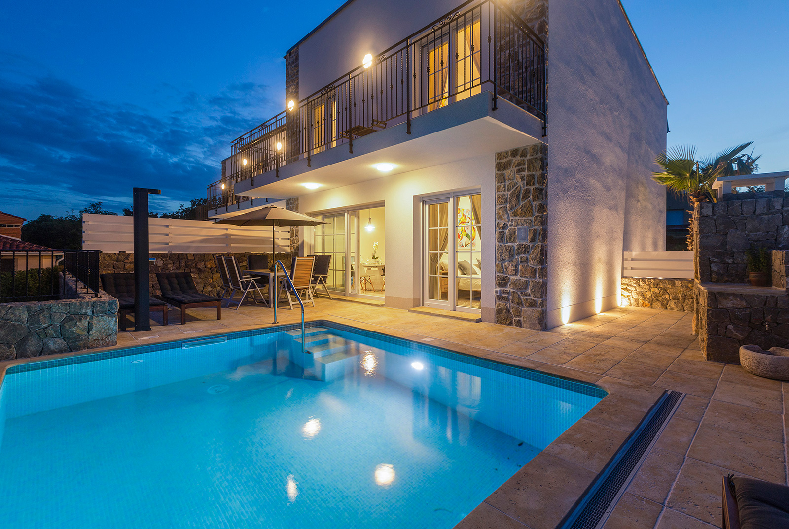 Ova prekrasna kuća za odmor s bazenom nalazi se na otoku Krku u malom mjestu Kornić. Udaljen je oko pet minuta vožnje od povijesnog grada Krka i grada Punta sa svojom dobro zaštićenom lukom. Zbog položaja na padini, iz kuće se pruža fantastičan pogled na more i maslinike po kojima je ovaj kraj poznat. Kuća, namještena s pažnjom na detalje, izgrađena je u tipičnoj otočkoj arhitekturi i sastoji se od uspješne mješavine modernih i tradicionalnih elemenata. Iz dnevnog boravka imate izravan pristup terasi s roštiljem, dnevnim boravkom i sunčalištem te grijanim bazenom. Glavna spavaća soba je u prizemlju, a druge dvije su na katu. Kuća je klimatizirana, ima podno grijanje, a na velikoj i ograđenoj parceli postoje i parkirna mjesta.