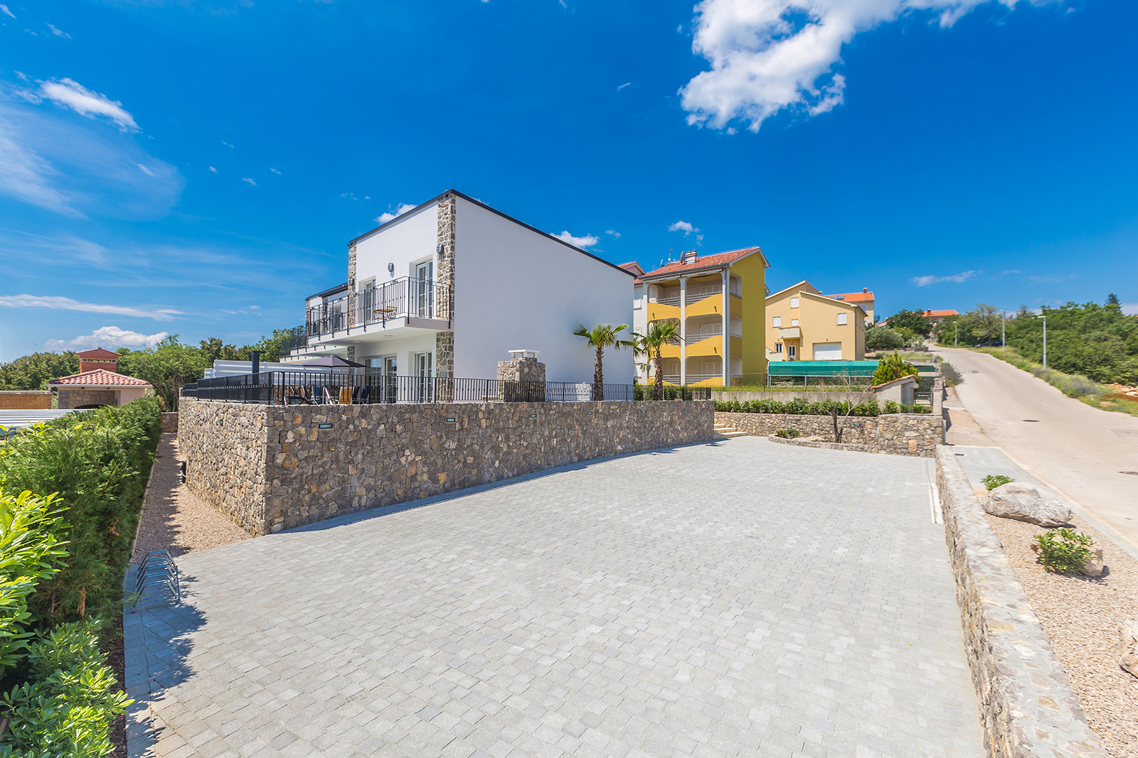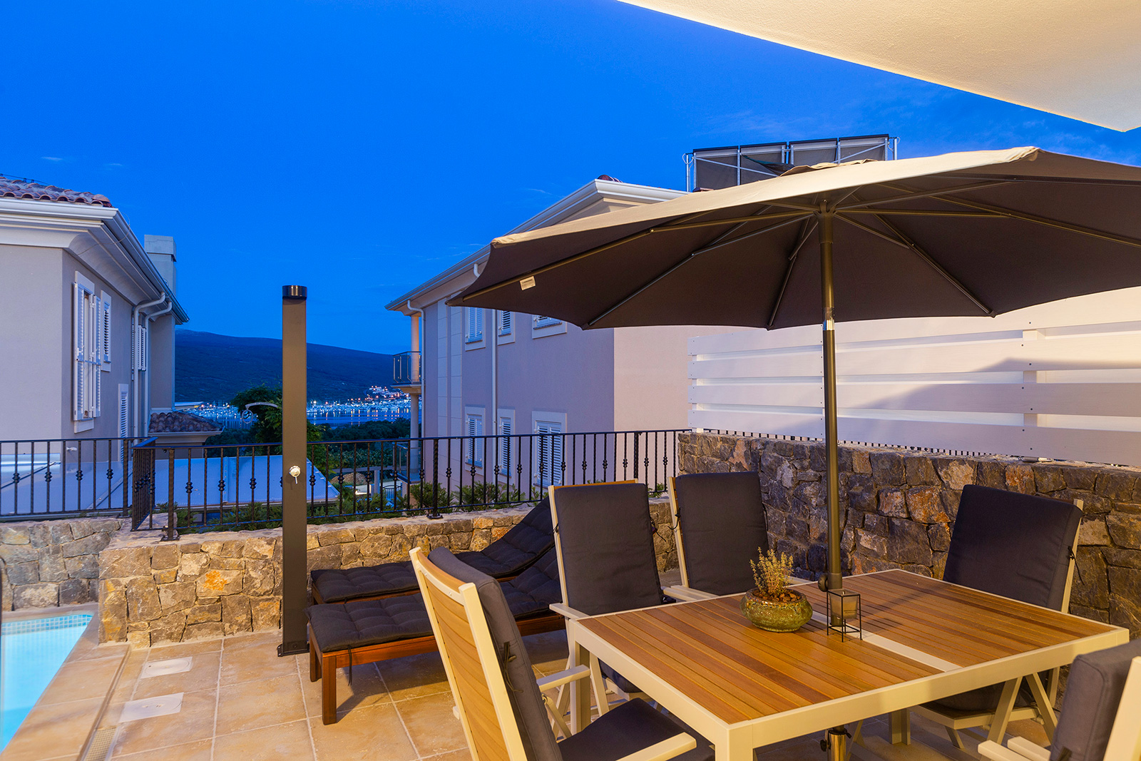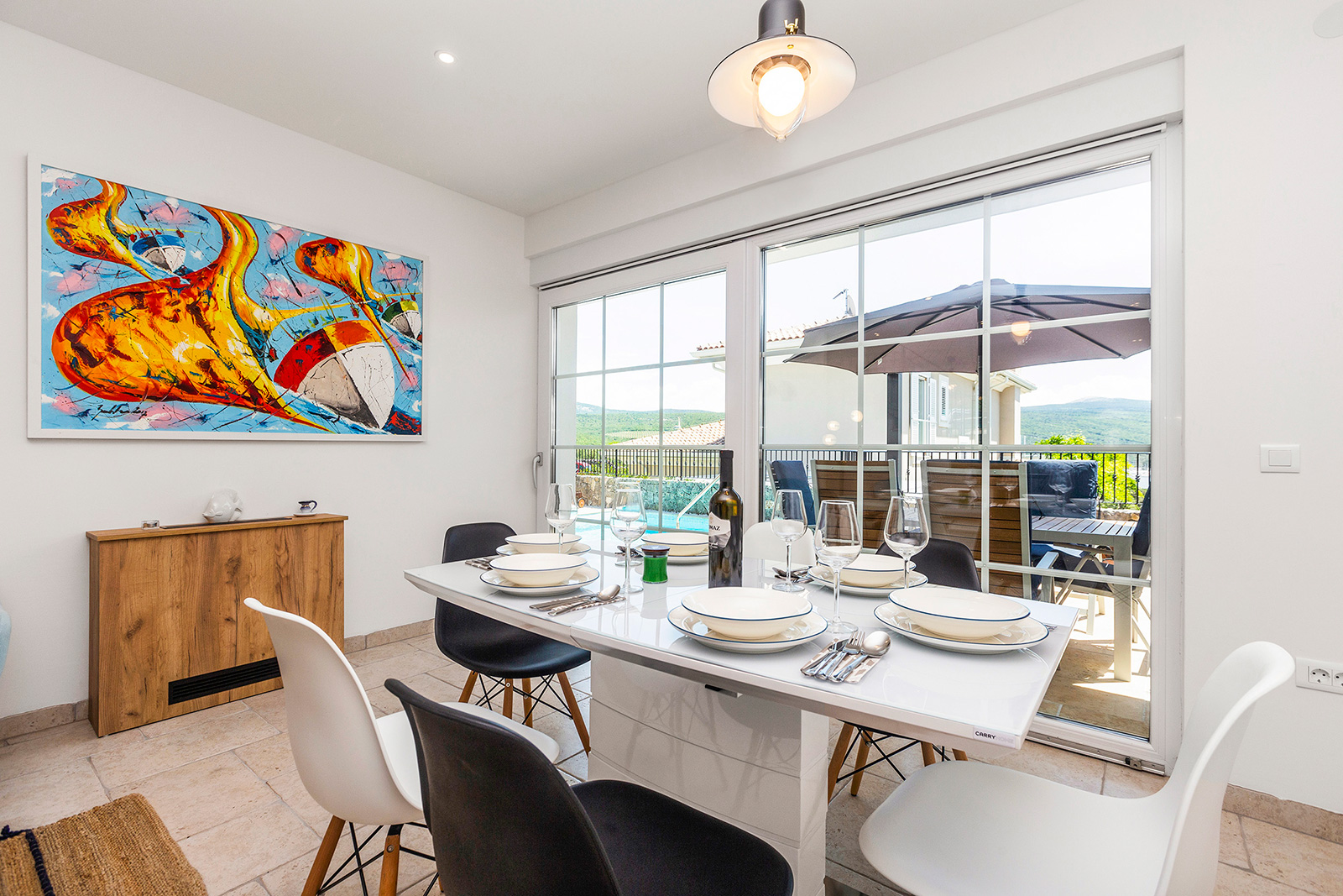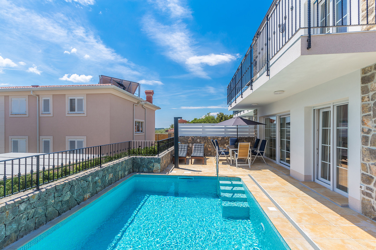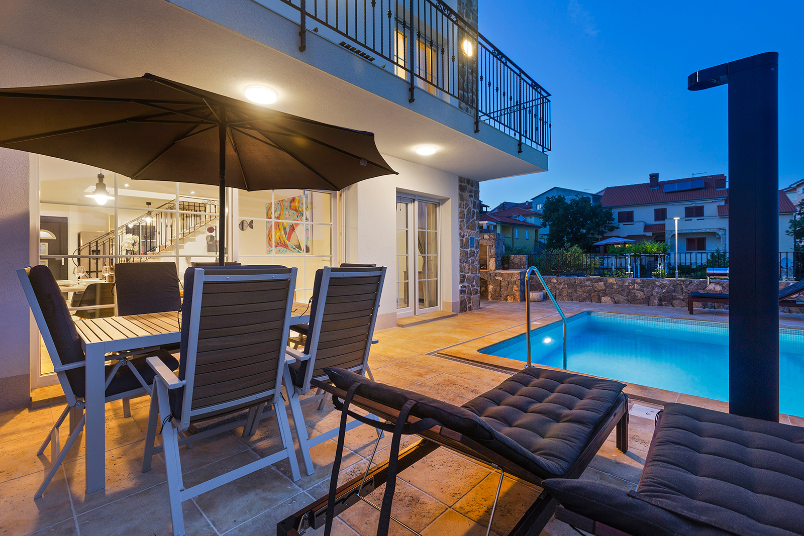 Ova prekrasna kuća za odmor s bazenom nalazi se na otoku Krku u malom mjestu Kornić. Udaljen je oko pet minuta vožnje od povijesnog grada Krka i grada Punta sa svojom dobro zaštićenom lukom. Zbog položaja na padini, iz kuće se pruža fantastičan pogled na more i maslinike po kojima je ovaj kraj poznat. Kuća, namještena s pažnjom na detalje, izgrađena je u tipičnoj otočkoj arhitekturi i sastoji se od uspješne mješavine modernih i tradicionalnih elemenata. Iz dnevnog boravka imate izravan pristup terasi s roštiljem, dnevnim boravkom i sunčalištem te grijanim bazenom. Glavna spavaća soba je u prizemlju, a druge dvije su na katu. Kuća je klimatizirana, ima podno grijanje, a na velikoj i ograđenoj parceli postoje i parkirna mjesta.