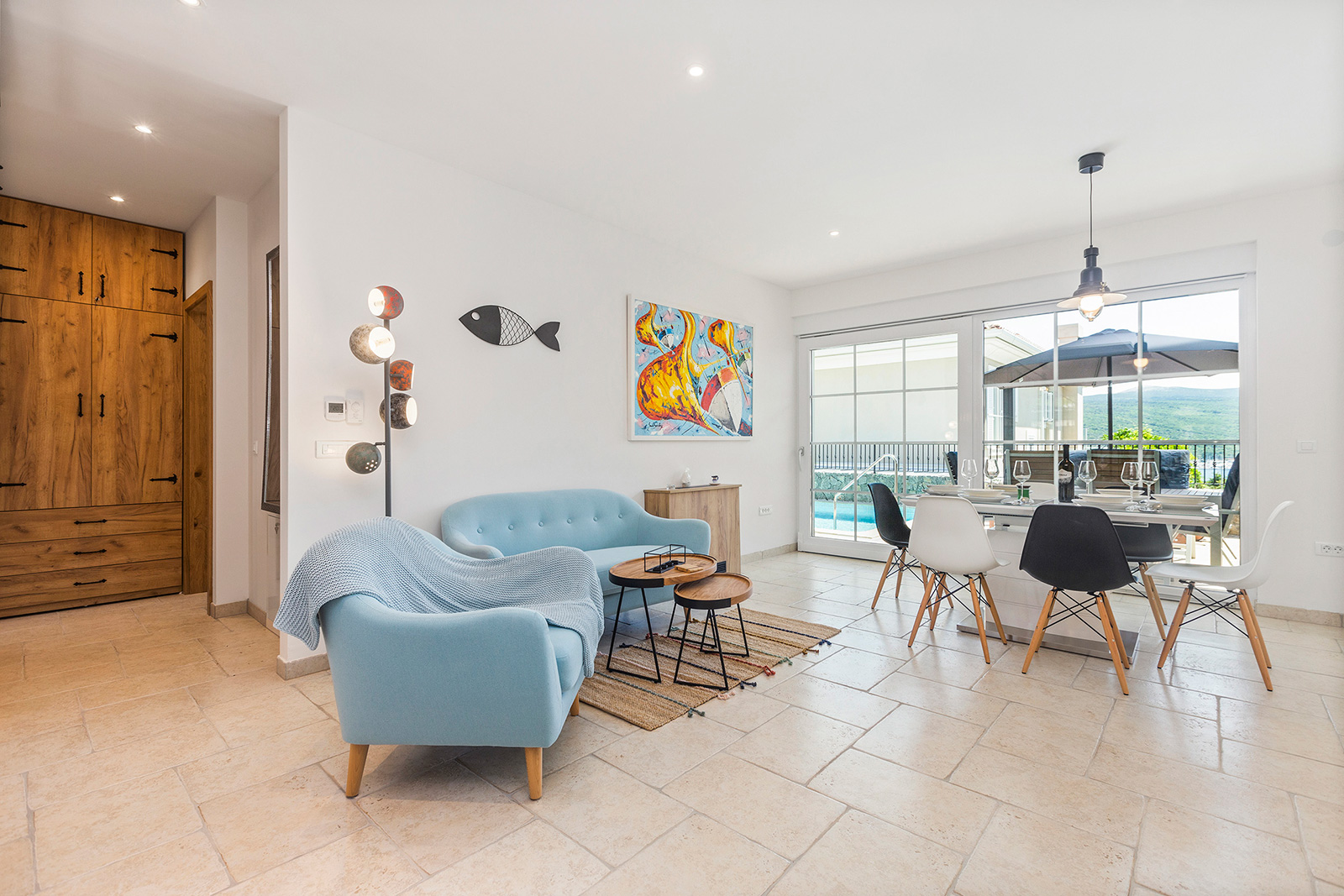 Moderna vila 103m2 dopunjena detaljima i slikama. Iz dnevnog boravka izlazi se na terasu gdje je smješten grijani bazen, sunčalište i roštilj.