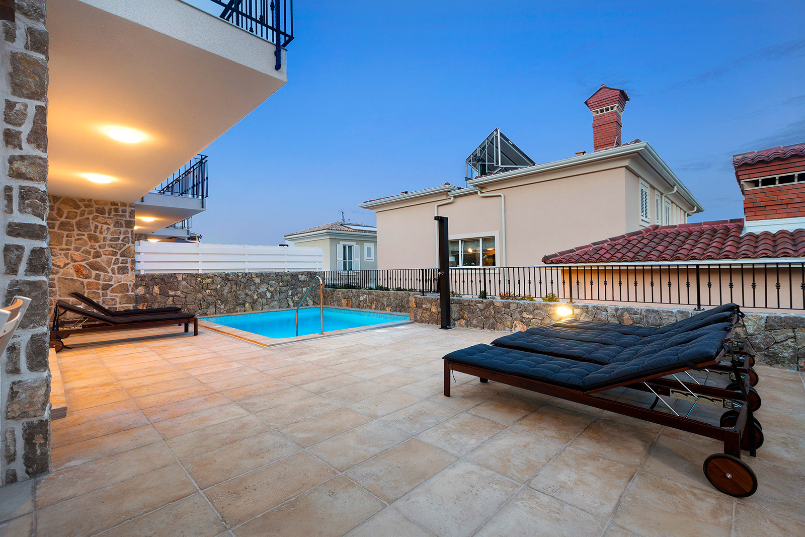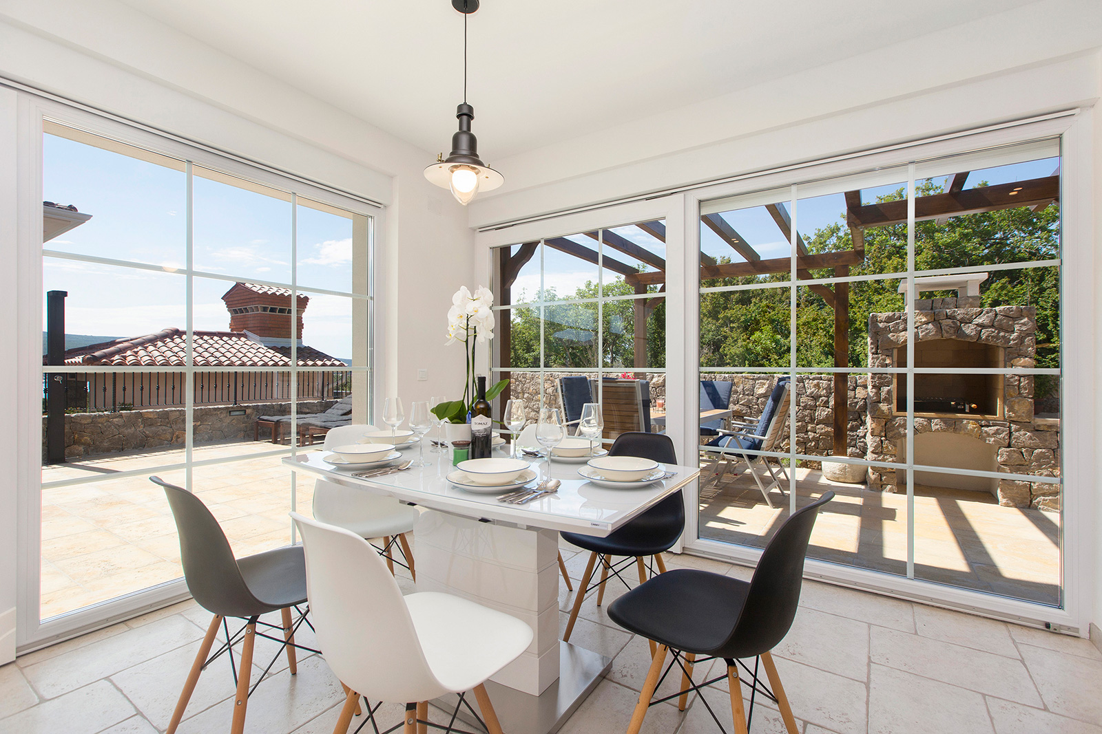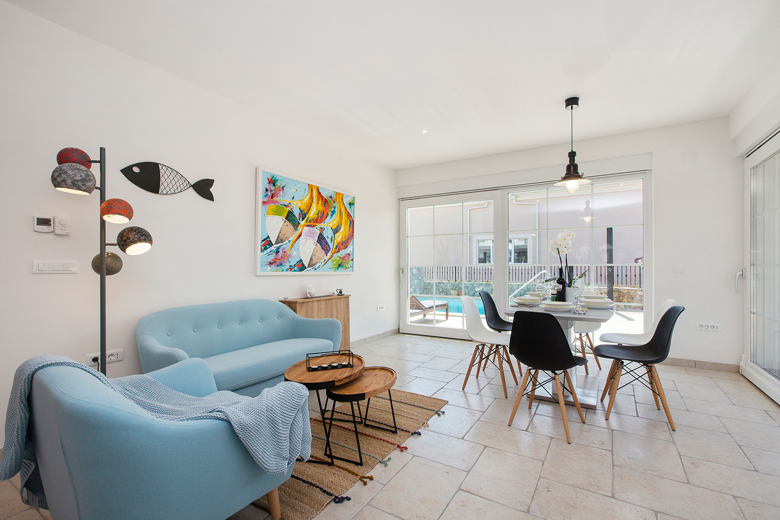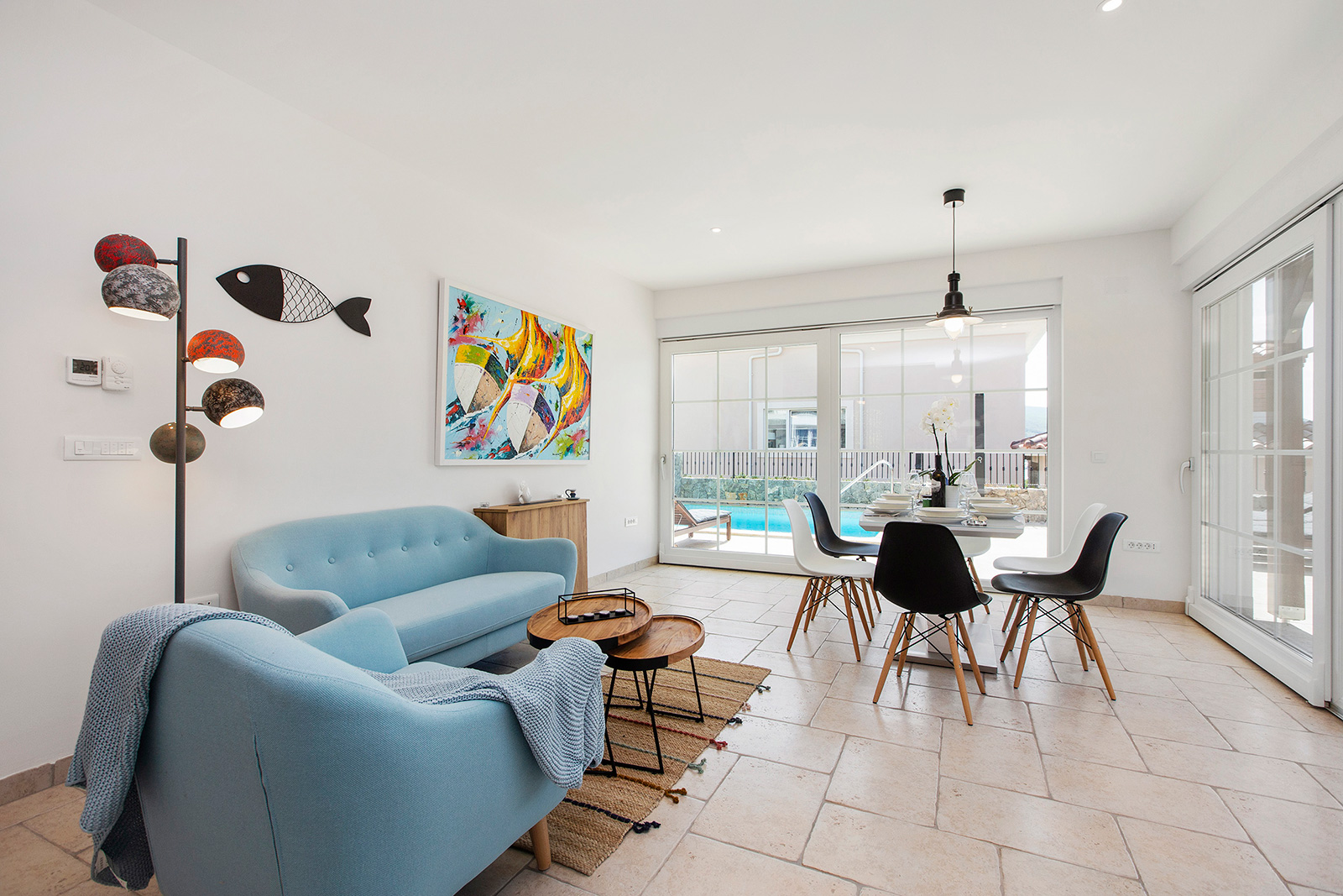 Moderna vila 103m2 dopunjena detaljima i slikama. Iz dnevnog boravka izlazi se na terasu gdje je smješten grijani bazen, sunčalište i roštilj.