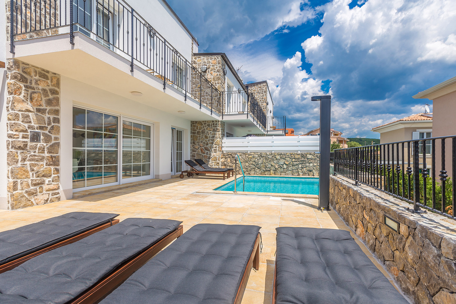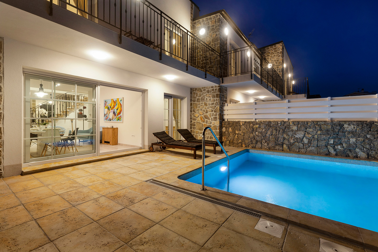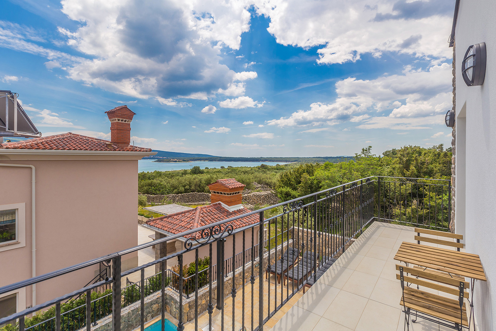 Ova prekrasna kuća za odmor s bazenom nalazi se na otoku Krku u malom mjestu Kornić. Udaljen je oko pet minuta vožnje od povijesnog grada Krka i grada Punta sa svojom dobro zaštićenom lukom. Zbog položaja na padini, iz kuće se pruža fantastičan pogled na more i maslinike po kojima je ovaj kraj poznat. Kuća, namještena s pažnjom na detalje, izgrađena je u tipičnoj otočkoj arhitekturi i sastoji se od uspješne mješavine modernih i tradicionalnih elemenata. Iz dnevnog boravka imate izravan pristup terasi s roštiljem, dnevnim boravkom i sunčalištem te grijanim bazenom. Glavna spavaća soba je u prizemlju, a druge dvije su na katu. Kuća je klimatizirana, ima podno grijanje, a na velikoj i ograđenoj parceli postoje i parkirna mjesta.